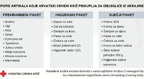 Popis artikala koji se prikupljaju rezultat je dogovora s Crvenim križevima iz Ukrajine i okolnih zemalja. Naime, tim Hrvatskog Crvenog križa, koji je protekli vikend boravio u Ukrajini, provjerio je stanje izravno na terenu kako bi se uvjerio što je točno potrebno ljudima izbjeglima iz Ukrajine, kao i najbolji način za dostavu pomoći. U skladu s tim, ali i iskustvom rada s izbjeglicama koje su zaštitu potražile u Hrvatskoj, kreiran je popis potrebnih proizvoda i Hrvatski Crveni križ trenutno neće prikupljati ništa osim navedenoga.